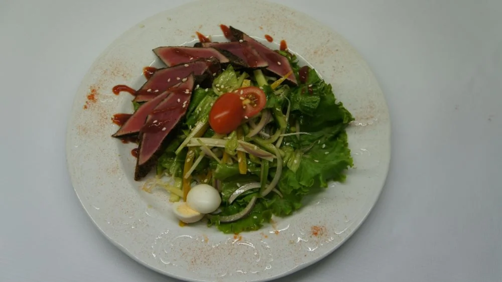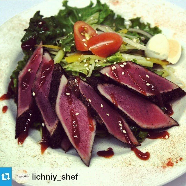 ШАГ 3 Смешать все продукты с соусом. Выложить на тарелку. Пожарить тунец, обваляв предварительно в молотом перце. Нарезать небольшими кусочками. Все украсить помидорами черри и перепелиным яйцом.