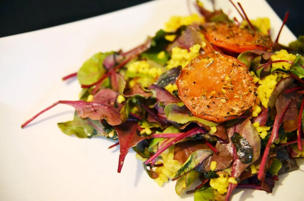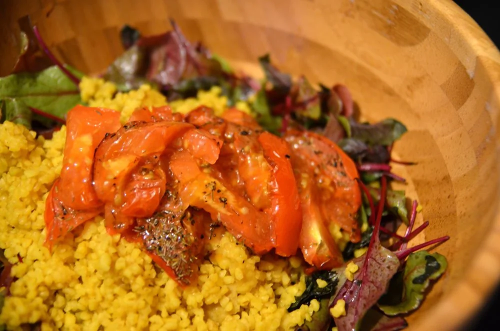 Теплый салат с мангольдом, булгуром и печеными томатами