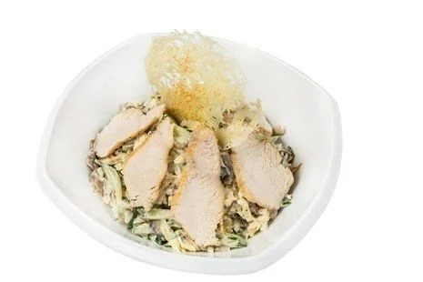 ШАГ 7 Выложить салат в глубокую посуду,украсив его тонкими ломтиками куры и чипсом из пармезана.