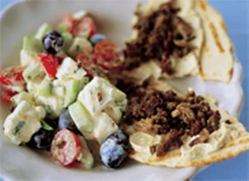 ШАГ 6 Добавить половинки помидоров в смесь из огурца, йогурта и сыра фета, разложитьсалат на 4 тарелки. Подавать с тортильями и телятиной.