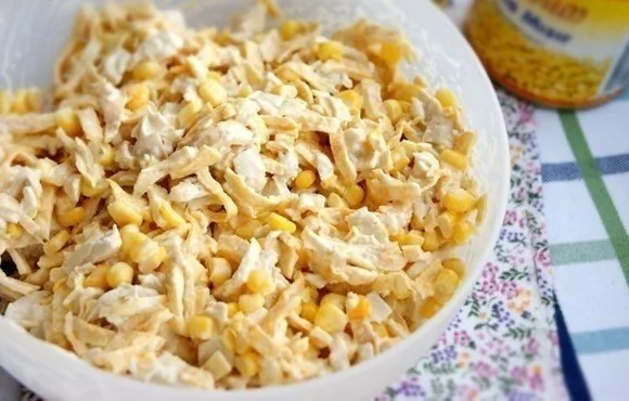 ШАГ 5 Смешать филе, блинчики, лук, немного посолить. Заправить майонезом. Добавить кукурузу и хорошо перемешать.