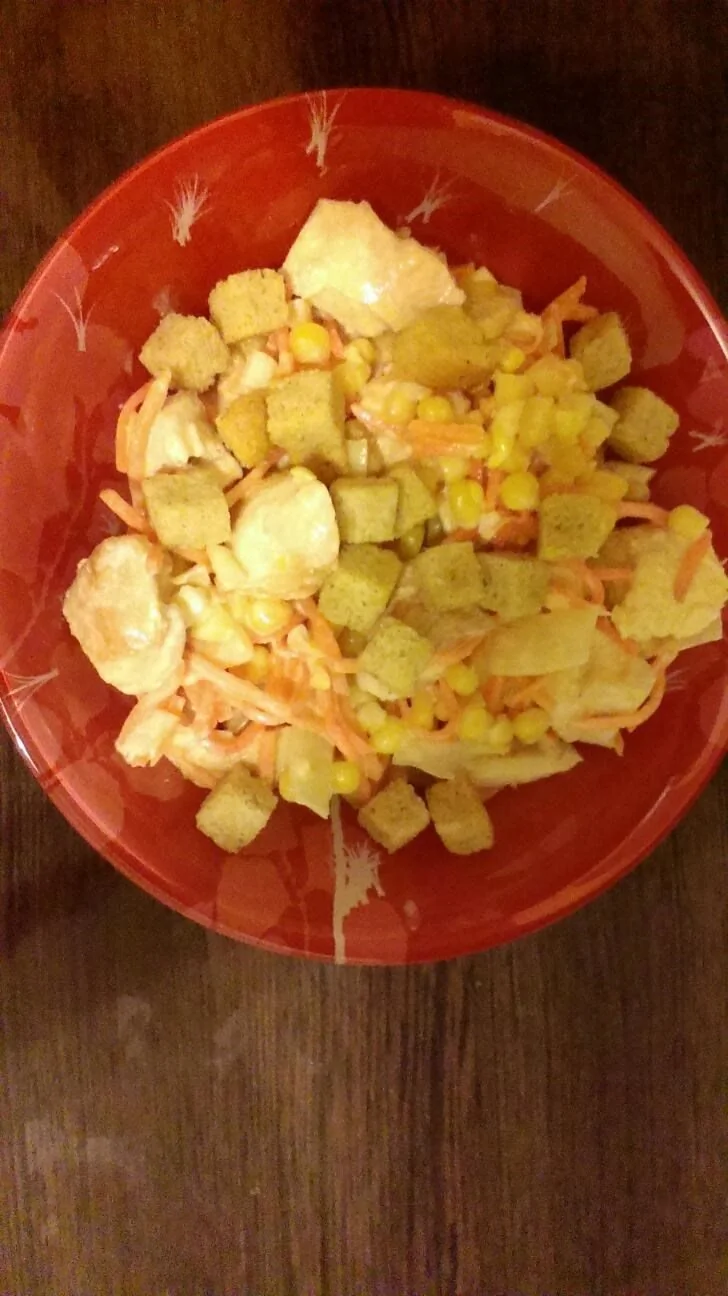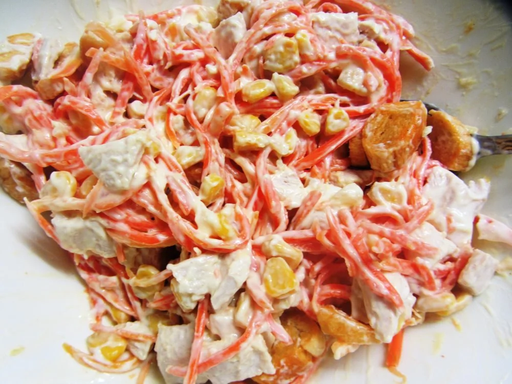 ШАГ 4 Перед подачей салат перемешать, заправить майонезом и посыпать сухариками.