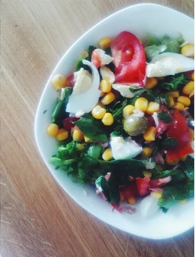 ШАГ 2 Выложите кукурузу на дно миски, затем положите помидоры (черри или нарежьте не большими кубиками обычные помидоры), сверху оливки, затем тунец и яйца (я режу их вдоль на 4 части) и добавьте немного каперсов и зелень.