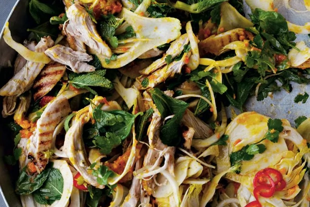 ШАГ 4 Когда курица слегка остынет, нарвать ее руками на довольно большие куски. Положить в большую миску, полить половиной апельсиновой пасты и тщательно перемешать. Добавить оставшиеся ингредиенты, в том числе оливковое масло. Осторожно перемешать. Попробовать и при необходимости добавить соли и перца, еще немного оливкового масла и лимонного сока.