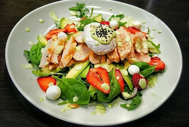 Салат с яйцом пашот, клубникой, авокадо и молодым шпинатом