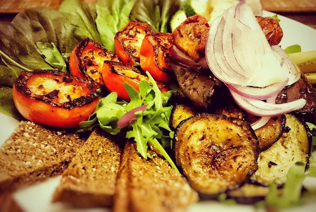 ШАГ 6 Салатные листья выложить в тарелку, разложить печёные овощи, печень, тосты, сверху на печень выложить по вяленому томату и присыпать всё лучком. Посолить и поперчить по вкусу.