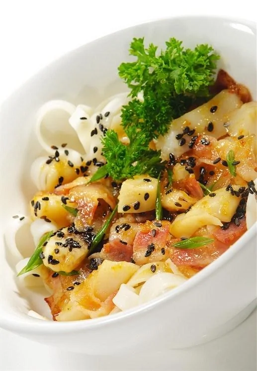 ШАГ 5 Выложить продукты в салатницу: сначала пасту, затем гребешки, яйца и овощи, сметану, перец и специи по вкусу, тщательно все перемешать. Украсить салат веточками петрушки или базилика, измельченным луком и посыпать кунжутом.