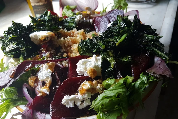 Зеленый салат со свеклой, белым сыром, киноа и чипсами из капусты кейл