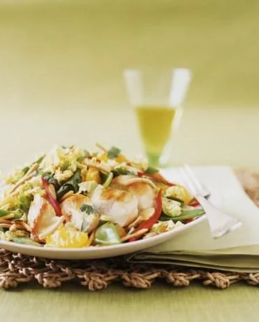 ШАГ 1 Мелко нарежьте готовые куриные грудки и смешайте с цедрой апельсинов.
