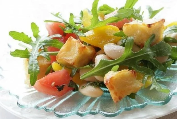 ШАГ 7 Перец, фасоль и помидоры смешать с зеленым салатом, полить заправкой.