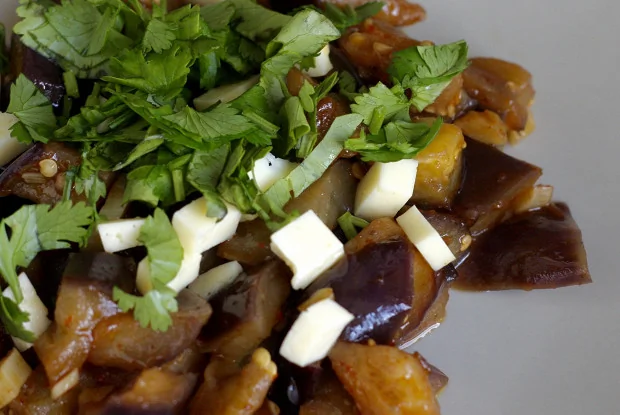 Тёплый салат с баклажанами, миндалем и козьим сыром