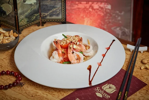 ШАГ 3 Сверху выложить предварительно приготовленные креветки и посыпать крошкой ореха кешью.