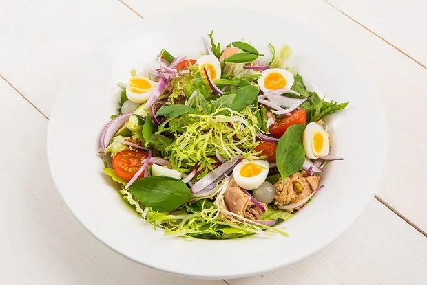 Консервированный тунец в собственном соку Лимонный сок Огурцы Помидоры Листья базилика Красный лук Зеленая стручковая фасоль Дижонская горчица Перепелиное яйцо Молотый черный перец Салат романо Салат айсберг Салат фризе главная Салаты Франц