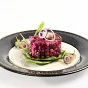 ШАГ 4 На тарелку выложить листья шпината, на подушку из листьев выложить винегрет через кулинарное кольцо. Украсить ломтиками селедки и кольцами лука.