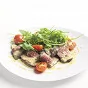 ШАГ 5 Ростбиф нарезать тонкими ломтиками и выложить на тарелку, полить соусом, украсить половинками черри и посыпать сыром.