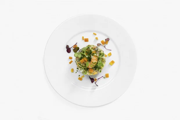 ШАГ 8 Через кольцо выложить салат на тарелку, украсить целой раковой шейкой, кубиками вареной моркови, нарезанной зеленью и кресс салатом.
