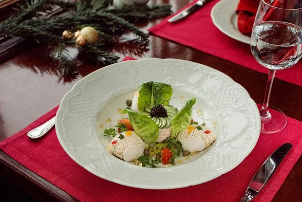 Отварной картофель Соленые огурцы Куриное яйцо Копченая курица Куриное филе Консервированный зеленый горошек Майонез Кетчуп Эндивий Огурцы Вареный говяжий язык Корнишоны Рябчик Молотая паприка Раки Каперсы Укроп Черная икра главная Сала