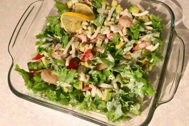 ШАГ 5 Достаем посуду для салата и кладем туда помидоры, авокадо, креветки нарезанные и кальмары, рвем туда же лист салата. По вкусу солим сам салат. В маленький стаканчик наливаем 4-5 ст. ложки (на глаз) оливкового масла, туда выжимаем дольку лимона, добавляем приправу для салата (на вкус), чуть перчика молотого и все это перемешиваем и поливаем сверху салатик. Перемешиваем еще немного и в конце посыпаем орегано, и можно полить цитрусовой заправкой для салатов, но это так же по вкусу.