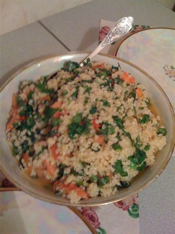 ШАГ 3 Перемешать готовый булгур с салатом из пряных трав и помидоров, дать настояться пять минут и подавать в качестве закуски.