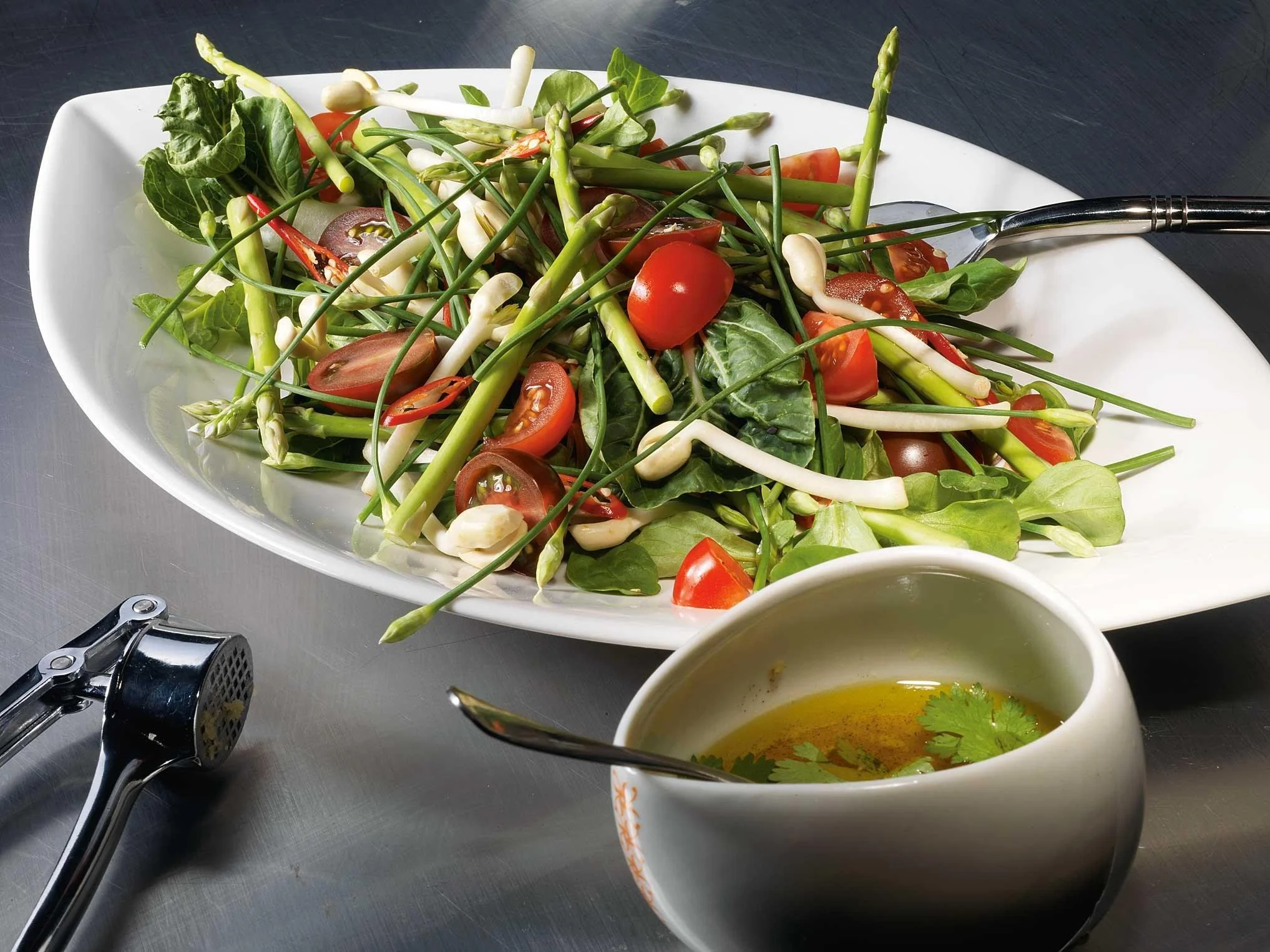 Салат из спаржи, помидоров, бобовых проростков, корна и пекинской капусты