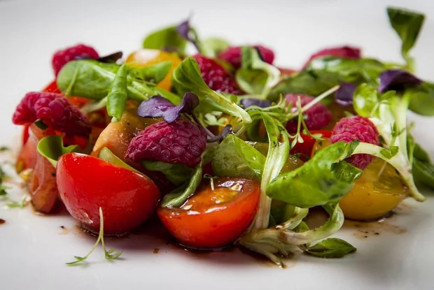 ШАГ 3 Салат выложить на тарелку, сверху выложить малину и украсить салатом корн, кресс-салатом, кресс-сакурой и кресс-горох.