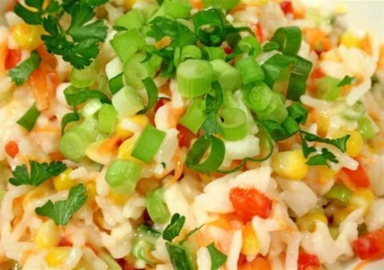 ШАГ 2 Мелко порежьте овощи, смешайте с рисом и остальными ингредиентами и хорошо перемешайте в миске.