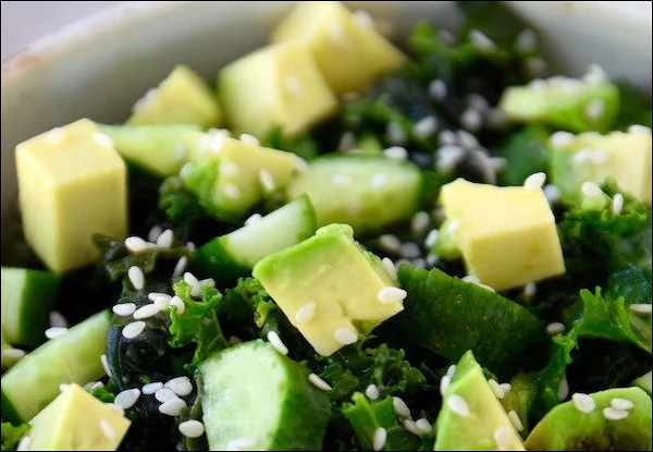 ШАГ 2 Смешать айсберг, огурцы, авокадо, салат чукка и кунжут.