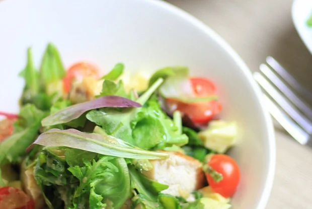 ШАГ 6 В салатницу или на тарелки выложить рукколу, куриное мясо, авокадо, помидоры, приправить солью и черным перцем, полить большей частью заправки, аккуратно перемешать.