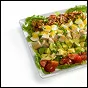 Салат романо Помидоры черри Куриное филе Бекон Куриное яйцо Авокадо Голубой сыр Красный винный уксус Вустерширский соус Дижонская горчица Лимонный сок Чеснок Оливковое масло Растительное масло Зеленый лук Молотый черный перец главная Сала