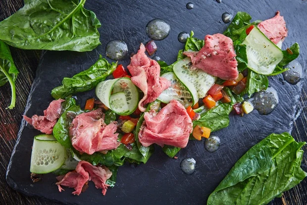 Бастурма Огурцы Сладкий перец Шпинат Кабачки Красный лук Морковь Соевый соус Бальзамический крем Растительное масло Лимонный сок Свежая мята Корень имбиря главная Салаты Европейская кухня