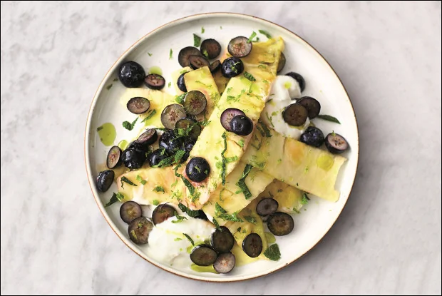 ШАГ 3 Смешайте немного мятного масла с йогуртом (остатки можно использовать позже) и выложите поверх фруктов. Посыпьте мелко натертой цедрой лайма, полейте лаймовым соком. Украсьте тонко нарезанными листиками мяты и сбрызните оливковым маслом extra virgin (да, вы уже поняли, очень вкусно!).