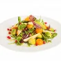 ШАГ 7 Салатный микс смешать с соусом. На тарелку выложить часть микса, сверху тыкву, брюссельскую капусту и дольки яблока. Посыпать зернами граната.