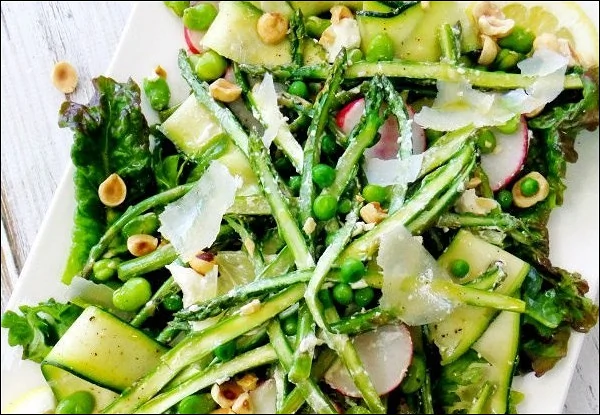 Весенний салат со спаржей, сыром фета, лимоном и фундуком