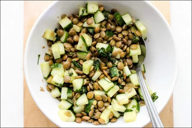 ШАГ 1 Отварить нут и чечевицу, нарезать кубиками авокадо и огурец.