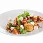 ШАГ 2 Соус сладкий чили смешать с оливковым маслом и измельченным чесноком, порвать несколько листьев базилика, крупно нарезанные помидоры и обжаренные баклажаны. Перемешать.