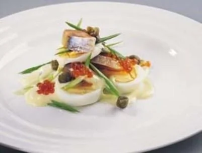 ШАГ 1 Норвежскую сельдь разделать на филе и нарезать ломтиками. Яйца сварить вкрутую, остудить и нарезать кружками. Сельдь и яйца уложить слоями в виде горки, пересыпая каперсами и нарезанным зеленым луком. Для приготовления соуса смешать охлажденное картофельное пюре, майонез и лимонный сок. Перед подачей к столу полить блюдо соусом и украсить красной икрой.