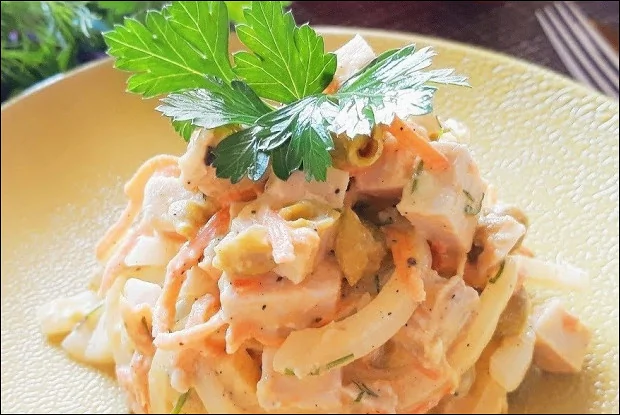 Салат с отварной свининой и зеленым горошком