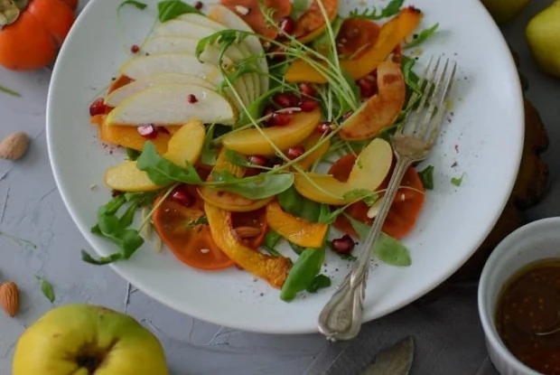 ШАГ 4 Затем выложить тыкву, айву, для красоты — веер из ломтиков груши, еще немного зелени, присыпать зернами граната и перед подачей полить готовой заправкой.