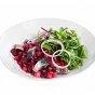 ШАГ 4 Иваси нарезать небольшими кусочками. На тарелку выложить винегрет, сверху положить несколько ломтиков иваси, а рядом зеленый салат.