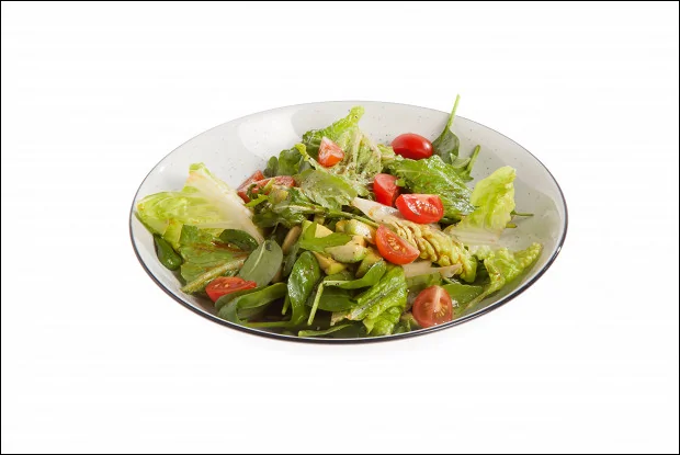 ШАГ 3 В большую миску нарвать салат романо, добавить листья шпината и руколы, добавить авокадо и черри, перемешать с соусом, поперчить по вкусу и подавать.