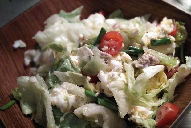 ШАГ 3 Порвать айсберг руками, порезать к нему остальные овощи. Нарезать отваренную заранее свинину.