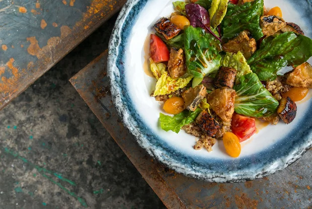 ШАГ 3 Соединить теплые киноа и баклажан, добавить нарезанные помидоры и микс салатных листьев.