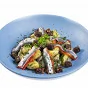 ШАГ 5 В порционную тарелку выложить салат, сверху выложить филе кильки и перец, посыпать бородинскими сухариками и зеленью.