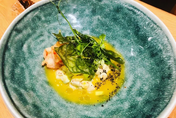 Салат из авокадо с дыней и креветками в бульоне из манго