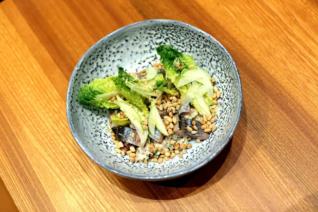 ШАГ 5 Сельдь нарезать небольшими кусочками, положить их сверху на салат. Добавить листья романо, тонко нарезанное яблоко, слегка обжаренные кедровые орехи. Потереть цедру лимона.
