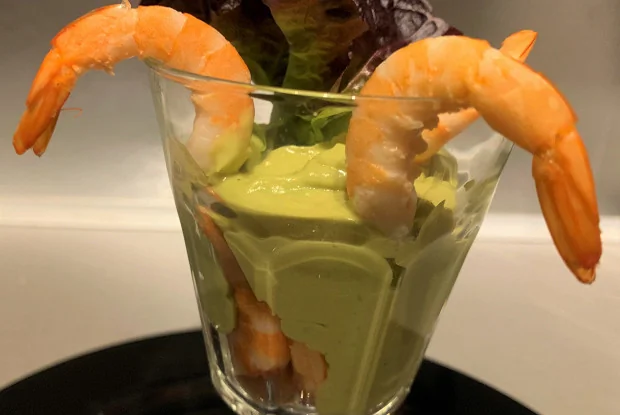 ШАГ 5 Разделить пюре из авокадо визуально на 2 части и добавить в первую часть один соус, а во вторую часть — другой соус. Перемешать. Слоями в бокалы или стаканы уложить сначала креветки, затем соус, смешанный с пюре авокадо, и сверху на край стакана красиво уложить креветки — 2–3 штуки. Украсить зеленью или листьями салата.