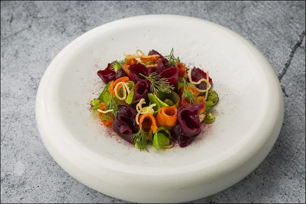 ШАГ 7 Выложить на тарелку винегрет, густо полить медово-горчичной заправкой, украсить свекольными листьями, веточками укропа и мелконарезанным зеленым луком.