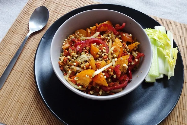 ШАГ 6 Добавить растительное масло. Подойдет любое масло без резкого запаха, например льняное или рыжиковое. Перемешать. Гречка-карри готова!