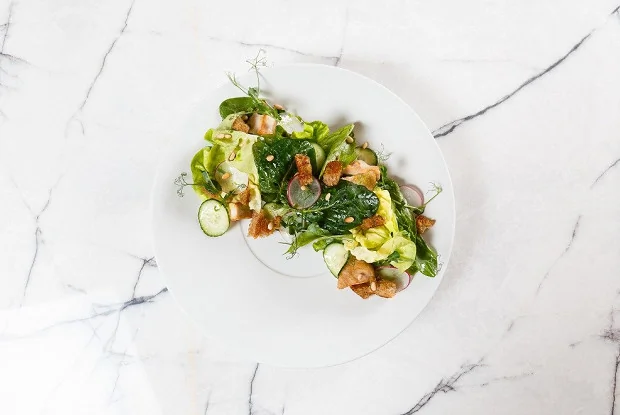 ШАГ 3 На дно тарелки выложить песто с эстрагоном, затем часть салатных листьев, на них — крупно нарезанную отварную куриную грудку и оставшийся салат. Посыпать кедровыми орешками и крутонами. Украсить веточками кервеля (по желанию).