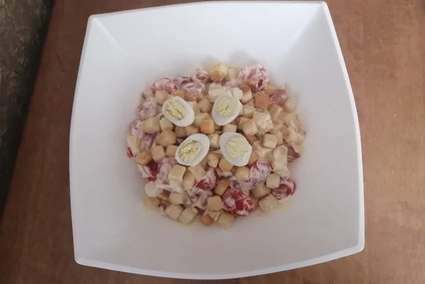 ШАГ 4 Курицу, сыр и черри положить в салатник и заправить майонезом. Аккуратно перемешать. Сверху посыпать сухариками.